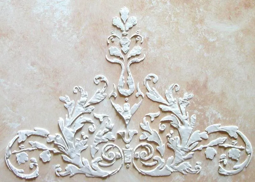 - Объемные. При создании таких трафаретов для стен вместо краски используется шпаклевка. Ее толщина при создании рисунка составляет 1–3 мм. За счет глубины рельефная поверхность выглядит значительно интереснее обычных изображений.