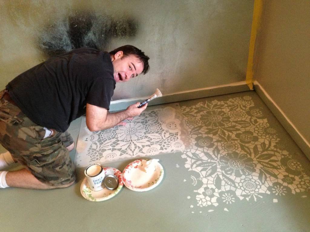 Необходимо выбрать костюм маляра, валик, кисточку, несколько цветов различной краски и купить понравившийся трафарет для декора стен в «Олстик». Далее очистить стену от старой краски, зашпатлевать тещины и щели, выровнять поверхность. После этого вскрыть слоем стяжки.