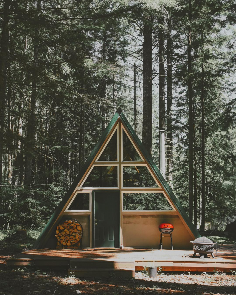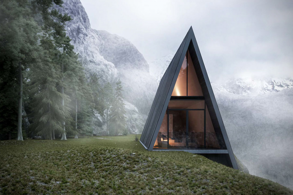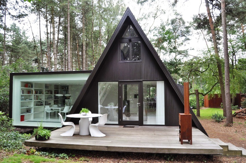 Треугольный дом на территории леса выглядит сказочно