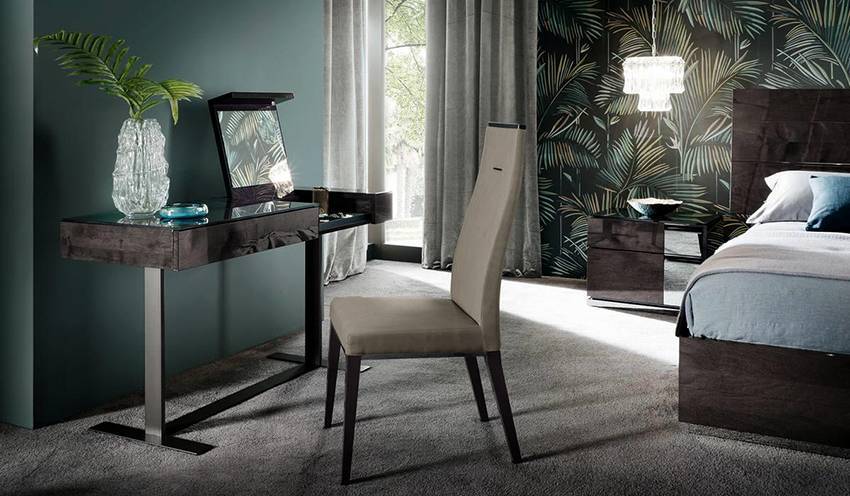 На фото туалетный прикроватный столик темного оттенка в интерьере спальни.