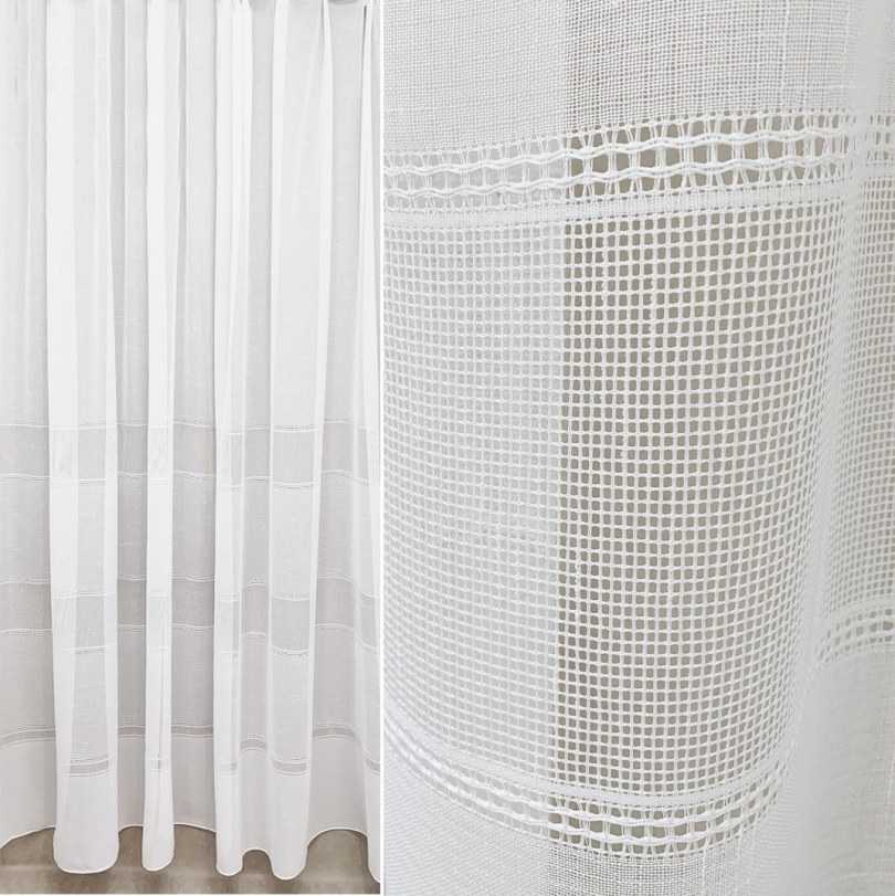Это ажурная ткань с переплетением волокон. Она хорошо пропускает свет, позволяет оригинально оформить оконный проём на кухне. Может быть с узорами или без, в зависимости от модели.