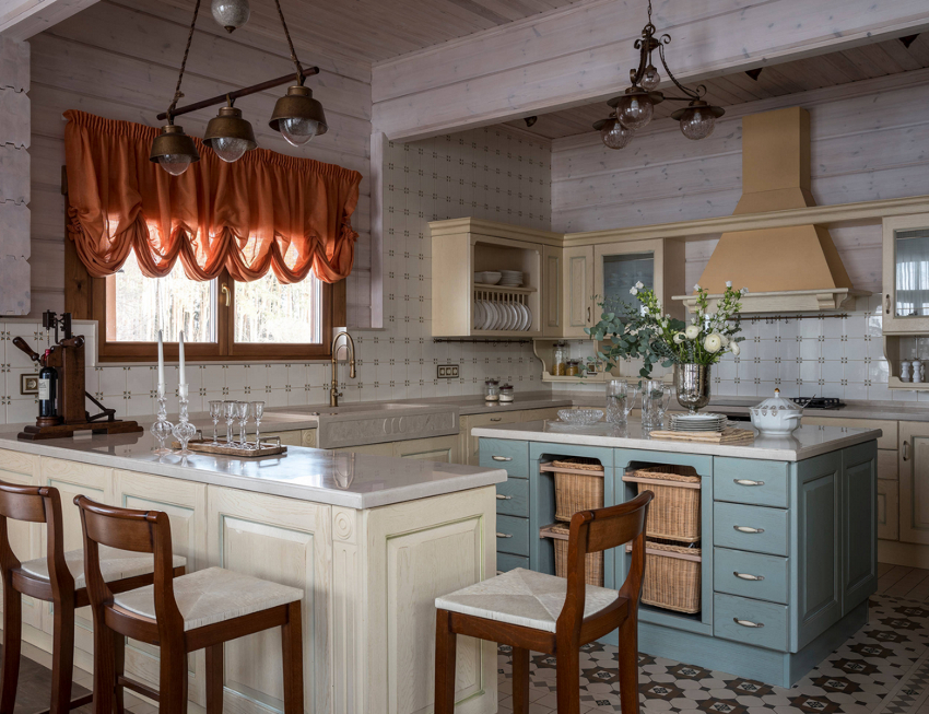 Светлые шторы кафе в интерьере синей кухни Источник design-homes.ru