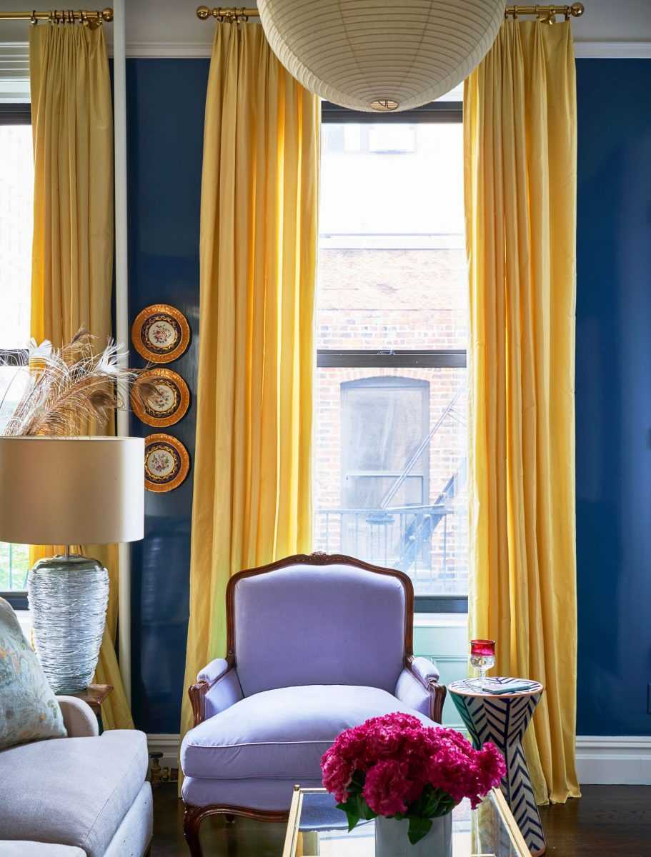 - Занавески длиной на 5-6 см выше уровня пола. Это самый популярный вариант, поскольку он не создает проблем при мытье полов, и шторы практически не пачкаются. Отлично подходят для декорирования проемов с балконной дверью. Но надо учитывать, что при этом потолки визуально кажутся ниже. Поэтому не рекомендуется так оформлять гостиные с потолками ниже, чем 2,5 м.
