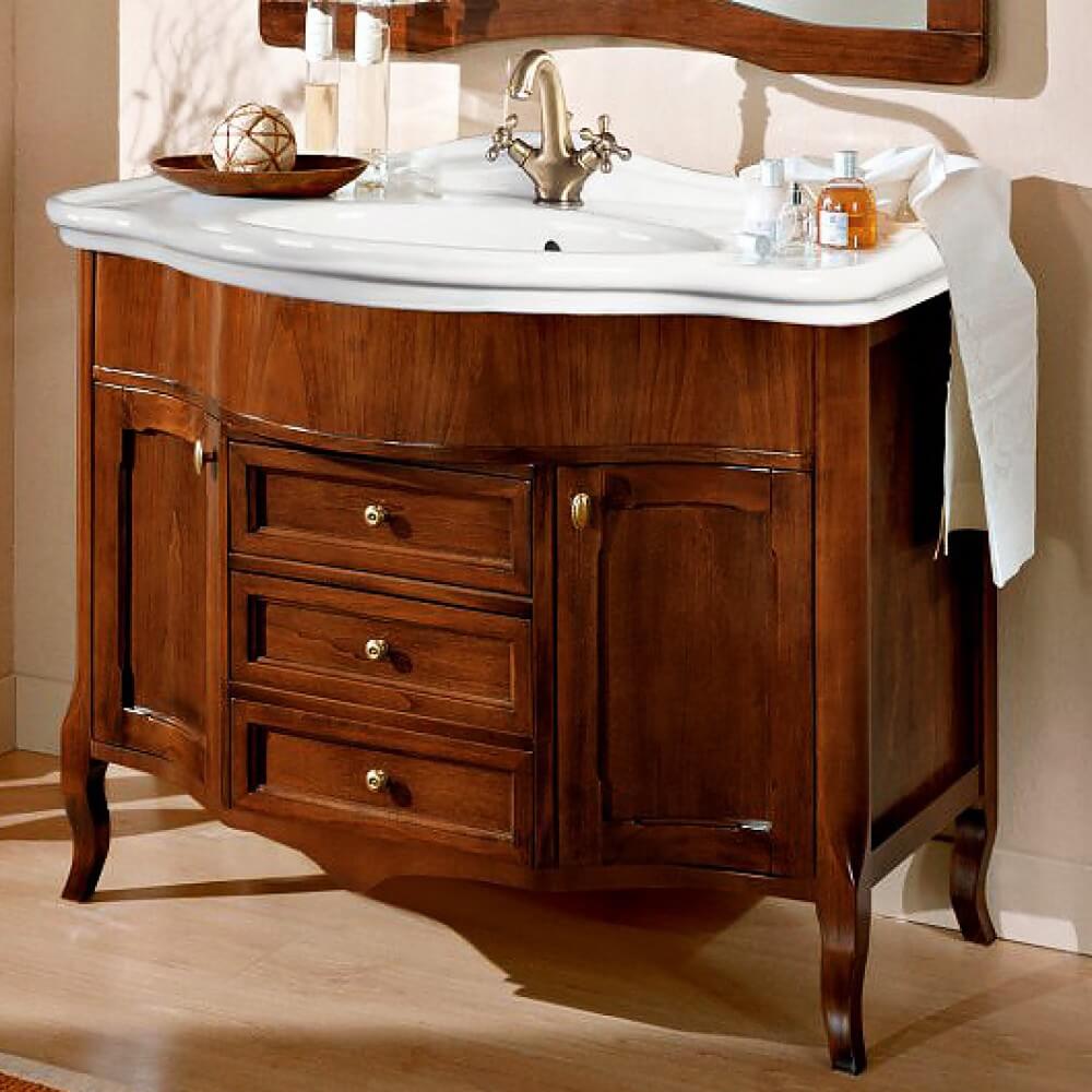 При исполнении ванной комнаты в стиле классицизма, которому присущи специфические облицовочные материалы с оттенками серебра и золота, а также элементами резьбы установка тумбы из нержавеющей стали или керамики не будет сочетаться с роскошью и богатством общего ремонта.