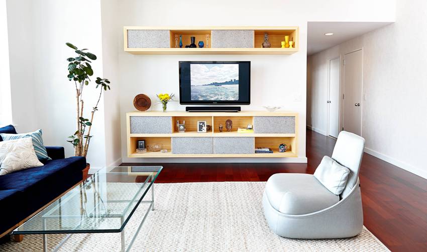 Если же акценты отсутствуют, можно смело выделить ТВ-зону. И лучше именно цветом: избыток аксессуаров современному стилю не подходит.