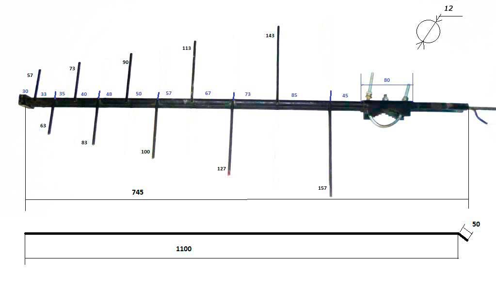 Все размеры антенны даны в миллиметрах. Диаметр трубок 12 мм, диаметр вибраторов 4 мм, размер зазора между трубками 6 мм. В начале антенны трубки закреплены пластиком, в точке крепления к мачте трубки спаяны.