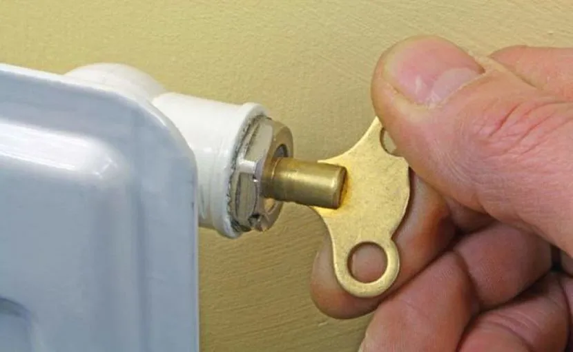- Далее ключом или отверткой раскручивается клапан, пока не послышится шипение от выходящего наружу воздуха. Нужно подождать до тех пор, пока шипение прекратится и из клапана тонкой равномерной струйкой без всяких пузырьков польется вода. Обычно процедура эта укладывается в 5 минут.