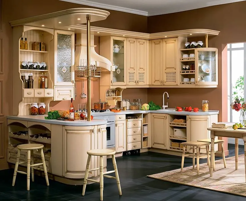 Угловой классический кухонный гарнитур с отдельной стоящей барной стойкойИсточник vestnikao.ru