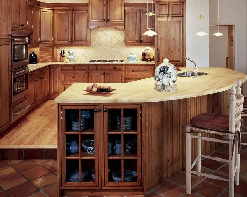 Гарнитур и стойка кухни в классическом стиле должны выглядеть консервативно, иметь плавные линии. Их изготавливают в светлых теплых тонах из натуральных материалов или адаптированных к натуральной древесине. Используют искусственный камень, массив или ЛДСП – ламинированную древесно-стружечную плиту. Бытовая техника частично или полностью скрывается за фасадами шкафов. Из декора приветствуется резьба по дереву, инкрустация мозаики, филенка, молдинги.