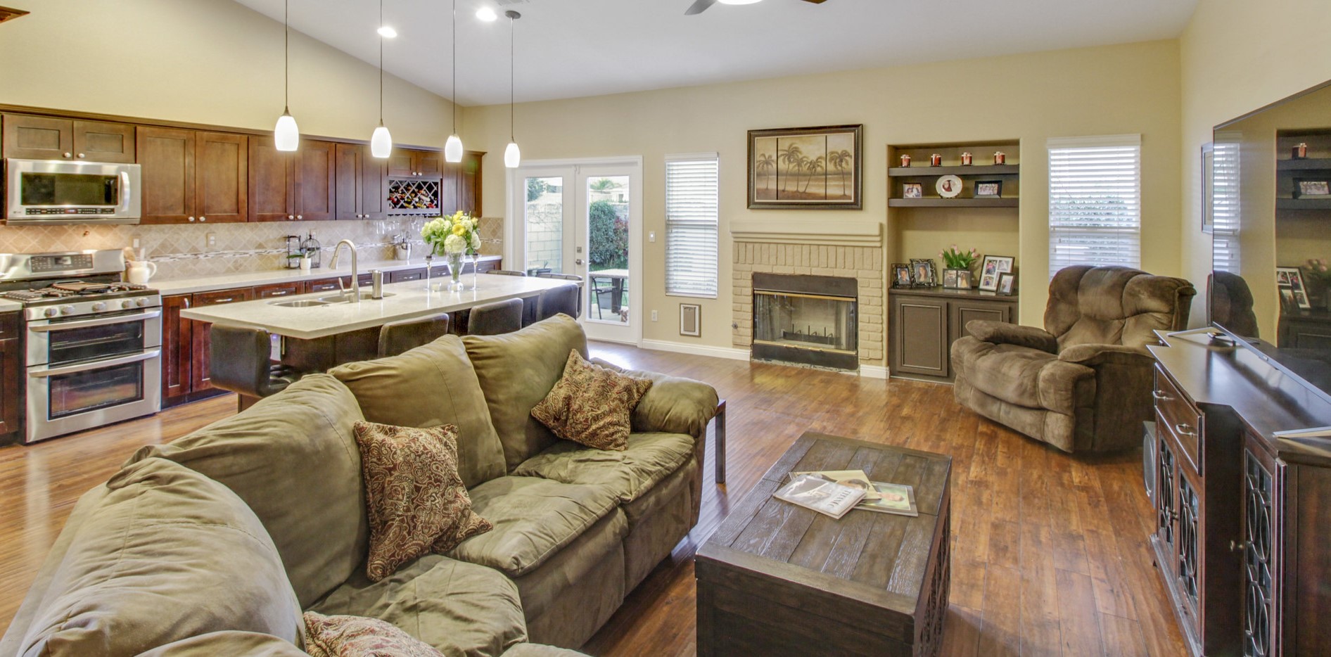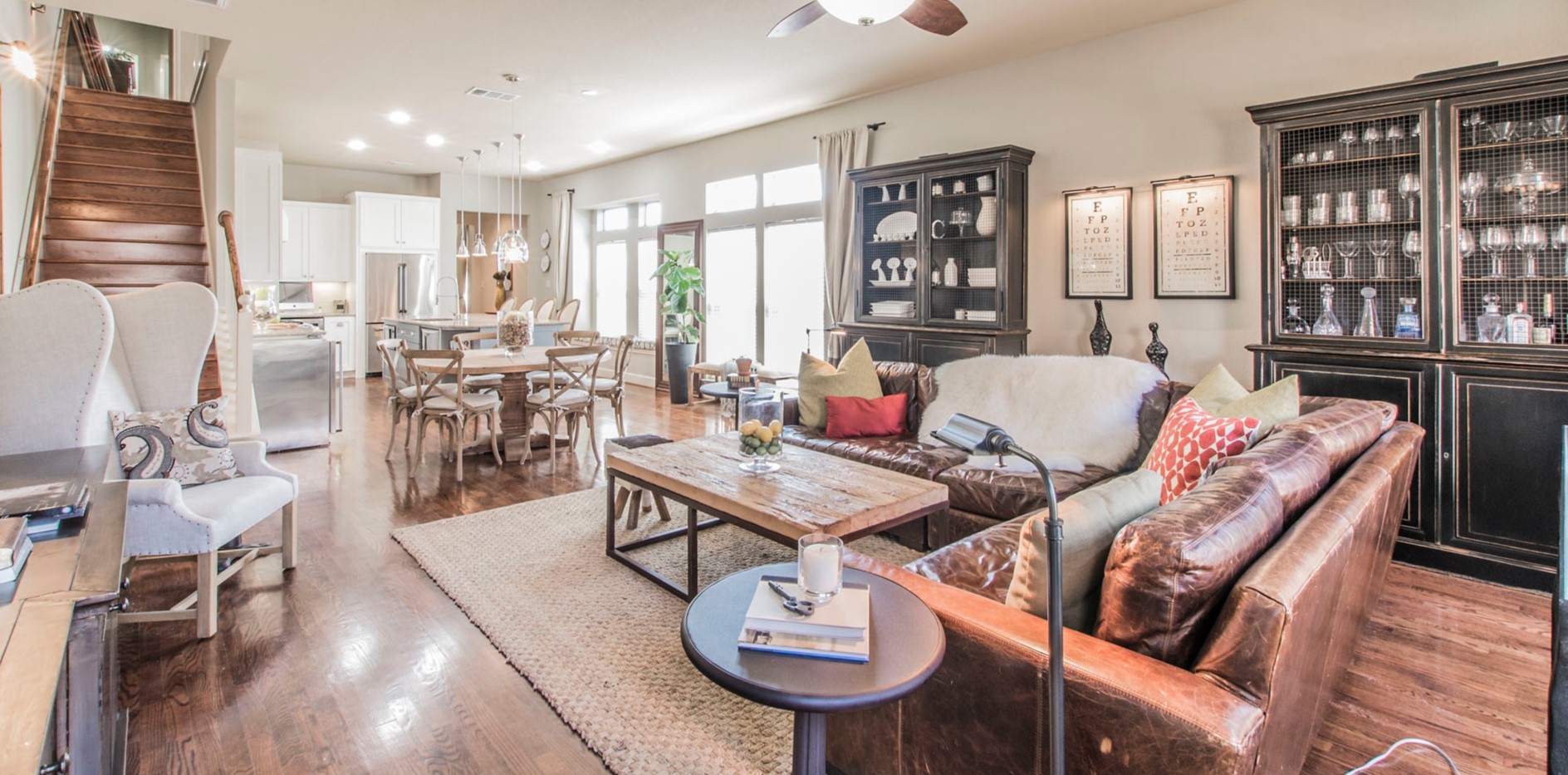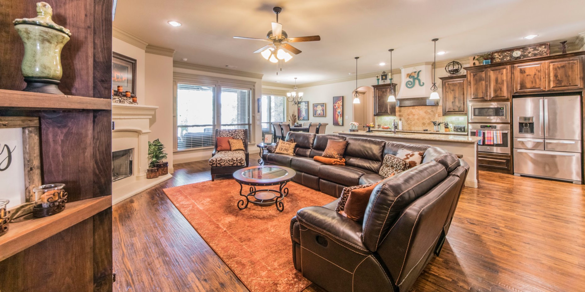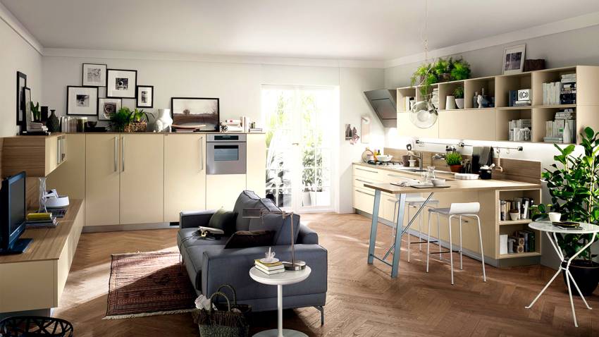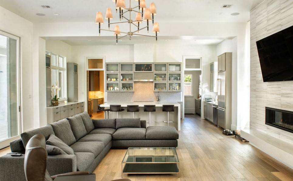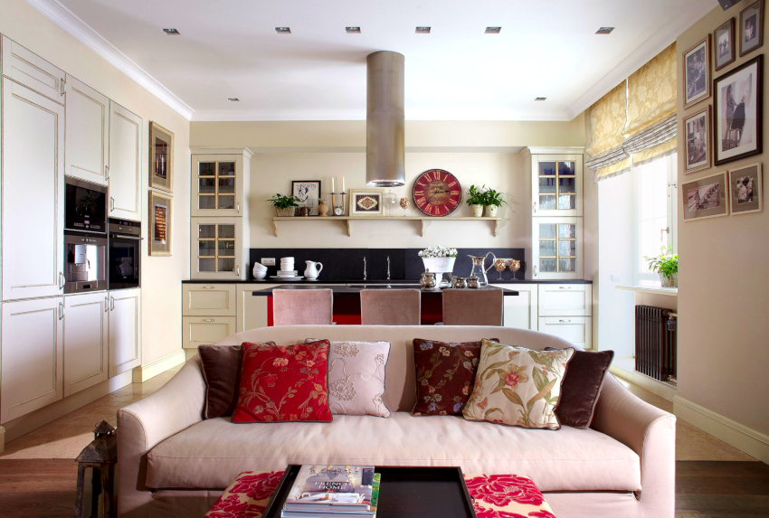 В большом помещении с помощью дивана можно успешно зонировать пространство. Самый распространенный вариант — мебель визуально отделяет место приготовления пищи от зоны столовой. При этом можно поиграть цветами, чтобы оттенок мебели соответствовал плитке или обоям в гостиной, а на кухне они кардинально отличались.
