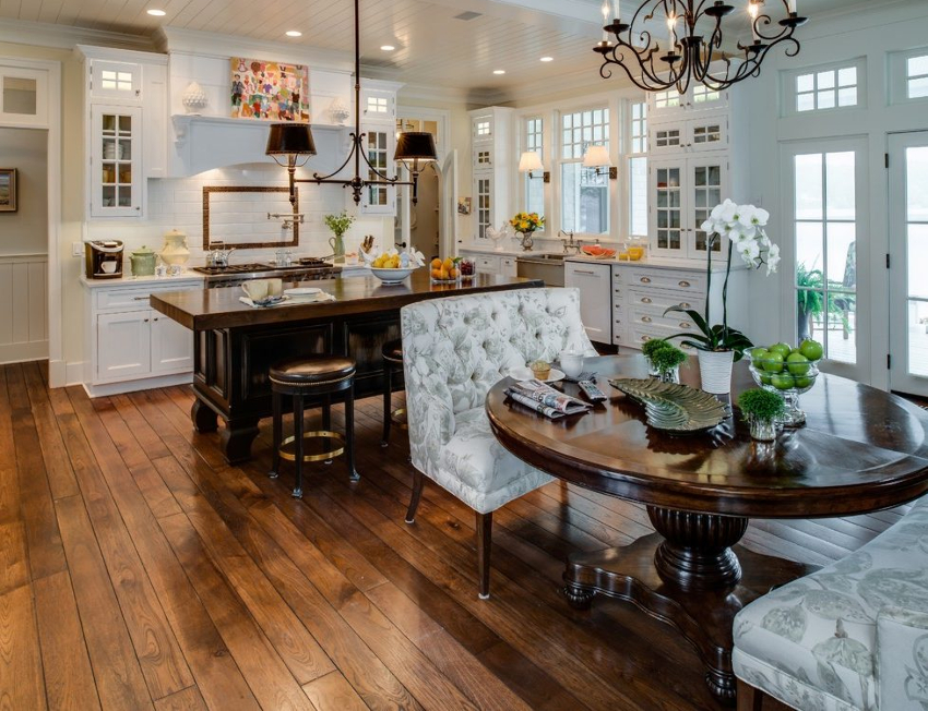 Кухня – место, где мебель подвергается наиболее частому загрязнению. Поверхности постоянно пачкаются, поэтому мягкая зона в кухне должна находиться максимально далеко от рабочих поверхностей. Материалы лучше выбирать темного цвета или покупать кожаные покрытия. Стоит всегда помнить, что чистить поверхности мебели, стоящей на кухне, придется намного чаще, чем предметы интерьера в других комнатах. Даже если каждый член семейства будет ежесекундно следить за собой и будет постоянно включена вытяжка, жирный пар, капли все равно будут оседать на мебели и очистить их очень сложно, чем просто пыль.