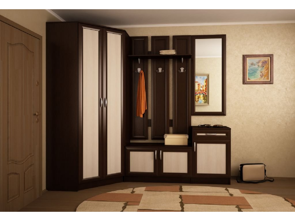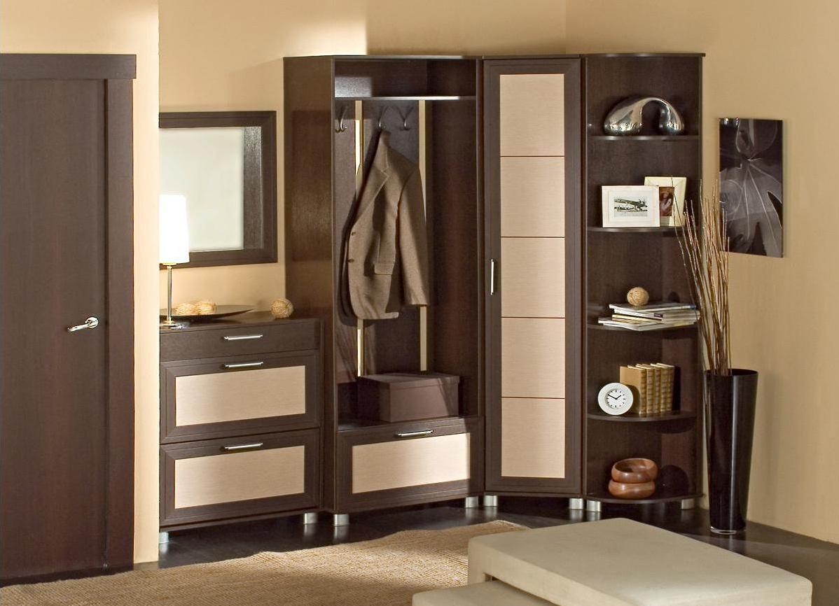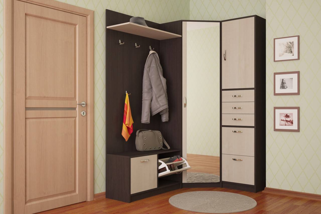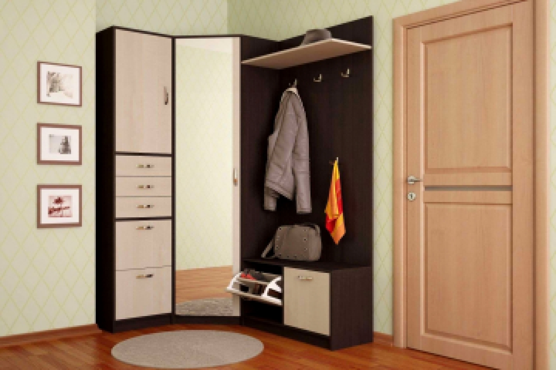 Практичными для маленького коридора считаются встроенные либо мини-модели. Угловой шкаф имеет стандартную комплектацию. Он может оснащаться шкафом для верхней одежды, открытой вешалкой, отделом для обуви, головных уборов, тумбой и так далее.