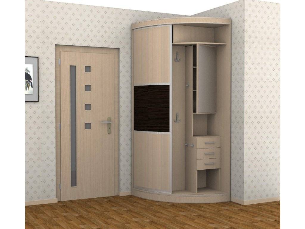 Радиусные шкафы-купе считаются угловыми конструкциями и похожи на сектор круга. Неплохое решение интерьера прихожей, так как занимают угловое пространство, которое обычно остается не заполненным.