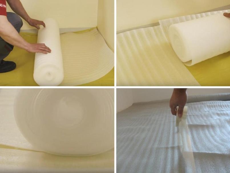 - Рулоны из вспененного полиэтилена – недорогая и удобная в работе подложка, которая неплохо переносит влагу, но обладает слабыми звукоизоляционными свойствами и коротким скором службы.