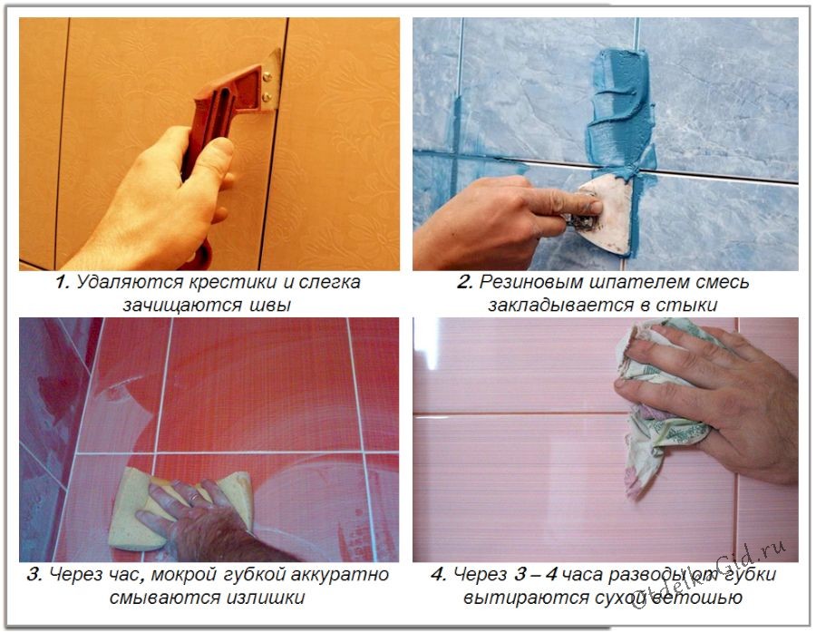 Спустя 3 суток после завершения укладывания плитки можно приступать к заполнению швов предварительно приобретенной влагостойкой затиркой, которая предназначена для ремонта в помещениях с увеличенным уровнем влаги.