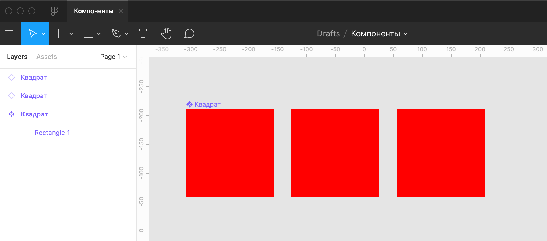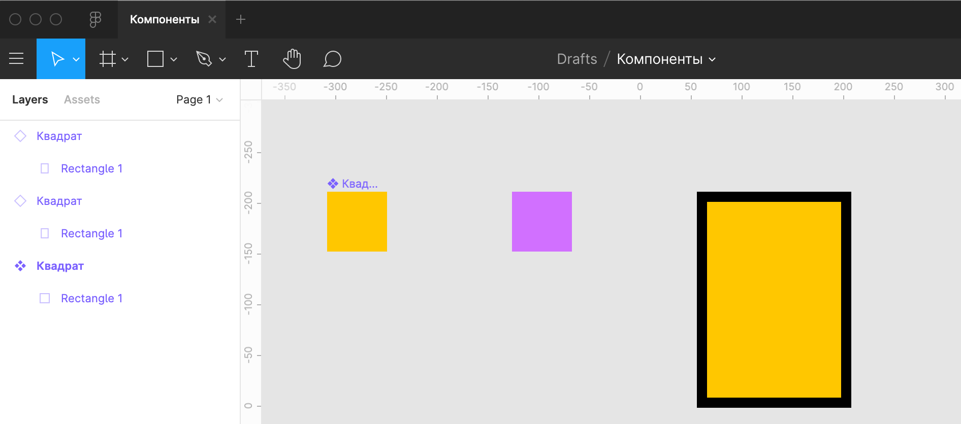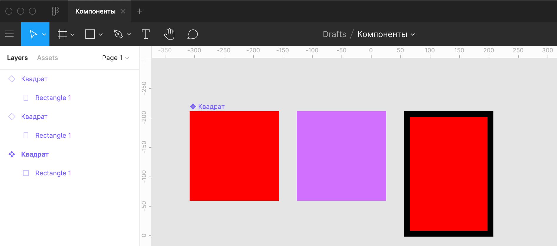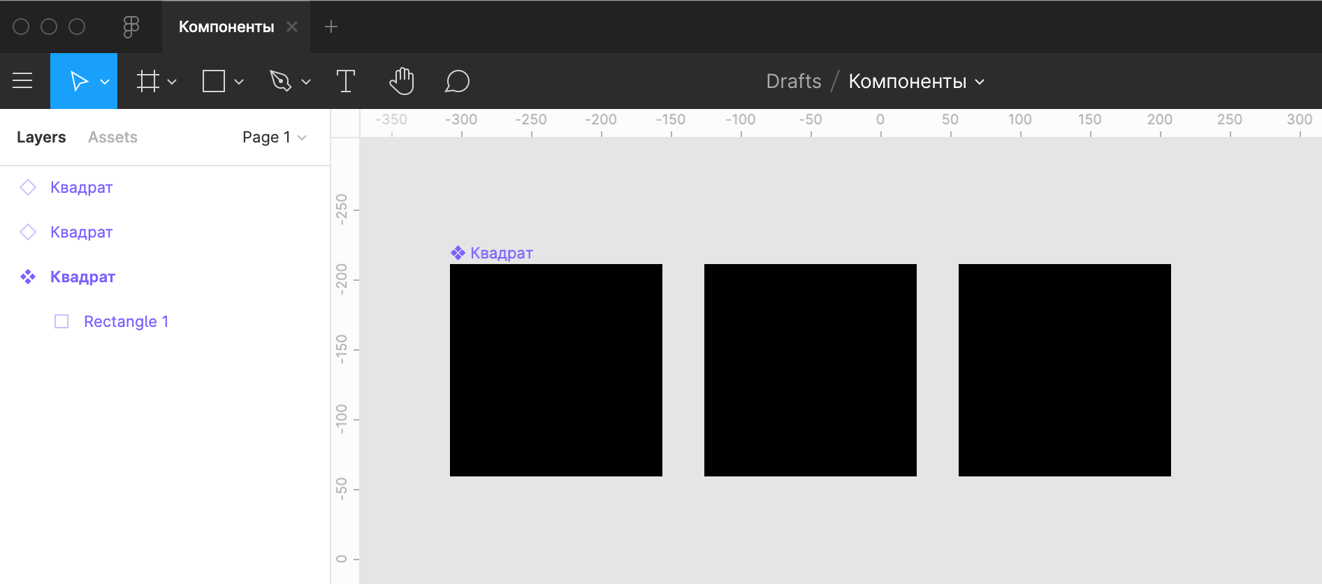 Допустим, мы создали основной компонент — чёрный квадрат. Затем добавили два его экземпляра.