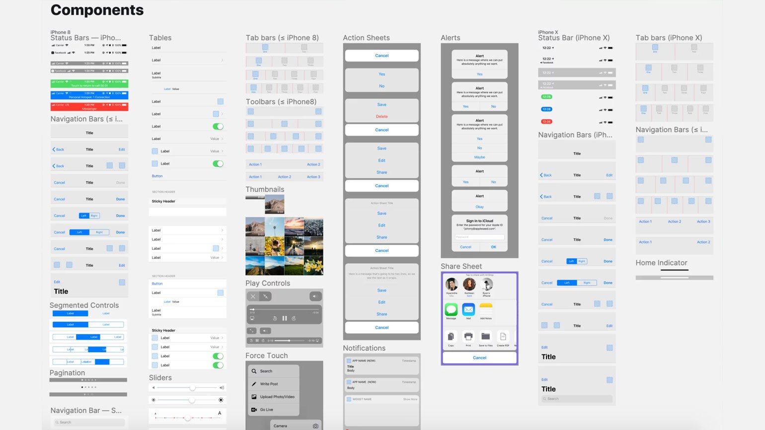 Фрагмент библиотеки компонентов Facebook* iOS 11 UI Kit, содержащей все визуальные элементы приложения Facebook*Скриншот: Skillbox Media