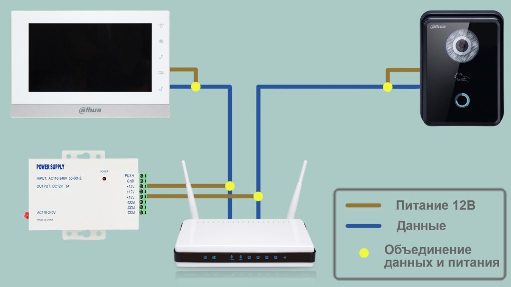 Это наиболее простой способ подключения, поэтому справиться с ним сможет даже новичок. Для соединения между собой внешнего и внутреннего блока необходимо использовать четырёхжильный кабель или два двухжильных провода. По двум жилам подаётся питание, а по другим двум — аудио- и видеосигнал.