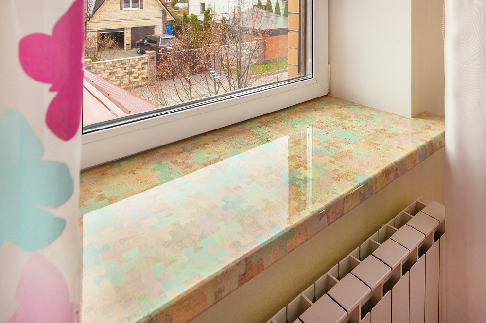Кроме этого, популярностью пользуются и подоконники с отделкой под натуральный камень, чаще всего это гранит или мрамор. Благодаря такому решению можно избежать покупки дорогого и тяжелого изделия, но получить столь же красивый вариант оформления окна. Если нужно как-то украсить помещение, что особенно часто бывает в случае с детской комнатой, то можно прибегнуть к использованию цветных вариантов подоконников.