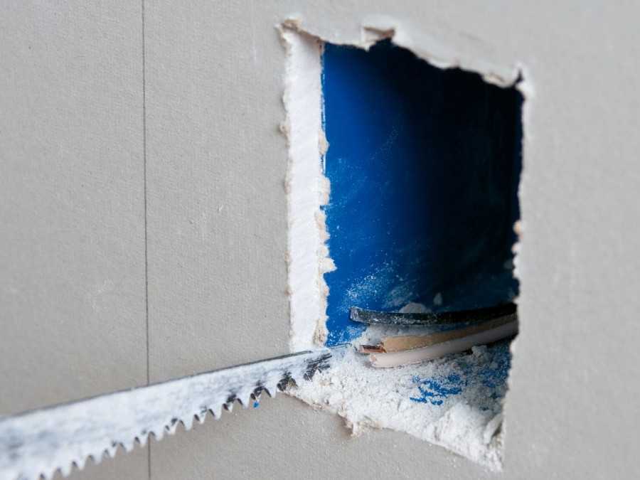- Выпиливаете прямоугольное отверстие в гипсокартоне;