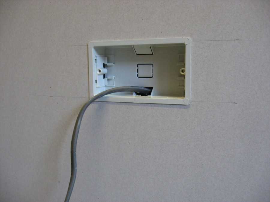 - При установке плит ГКЛ на клей прокладка кабеля осуществляется по штробам, вырезаемым в поверхности, а место для подрозетника выдалбливается.