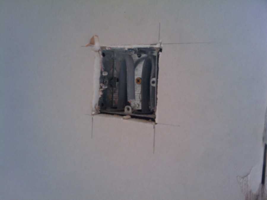 - Вырежьте отверстие, зашлифуйте края, обработайте грунтовкой и зашпаклюйте, добавляя в рабочий раствор асбест;