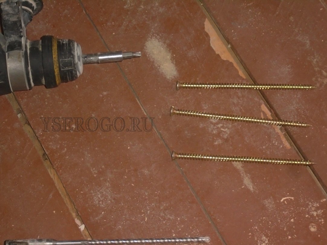 - шагом не более 15 см сверлят в половицах отверстия, которые на 1-2 мм меньше диаметра саморезов;