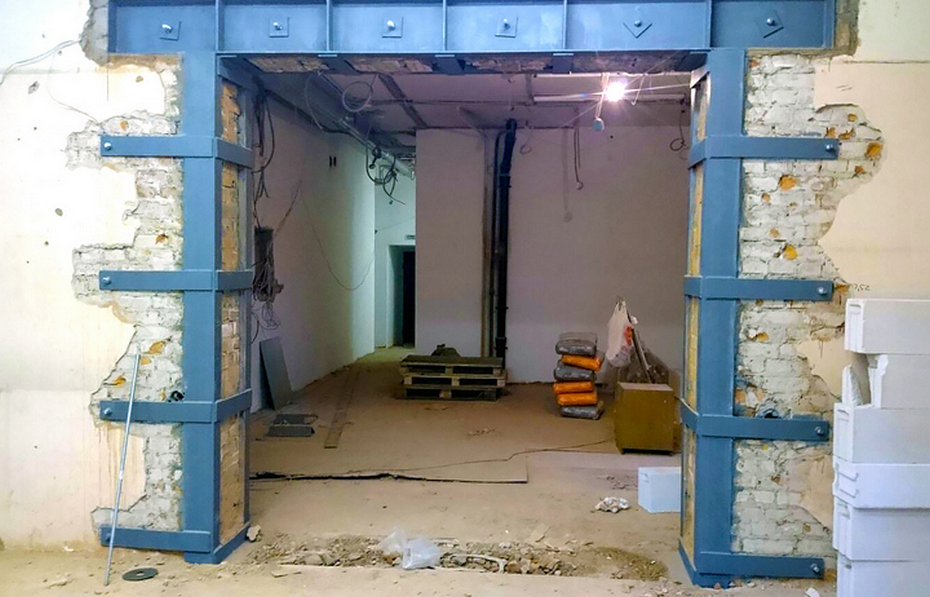 Пример 1. Благодаря слаженной работе специалистов удалось узаконить проем в несущей стене на первом этаже 12-этажного здания и укрепить металлическими конструкциями.