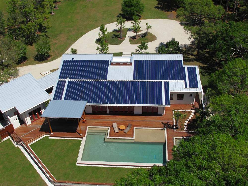 Элегантный зеленый дом столь хорошо продуманной конструкции расположен в городе Сарасота, штат Флорида. Отрицательное значение оценки системы HERS, как вы уже догадались, означает, что дом является не просто энергетически самоокупаемым, но производит энергии больше, чем потребляет. Как это стало возможным? Более всего так называемой «климатической благоприятности» дома способствует гибкая и легкая солнечная установка с тонким слоем аморфной двуокиси кремния мощностью в 14,2 кВт. Но и без участия неутомимого светила Power Haus заслуживает достаточно высокой оценки в 42 балла по системе HERS. Достигнуть столь впечатляющих результатов проектировщики смогли за счет внедрения массы разнообразных технологических прикладных систем.