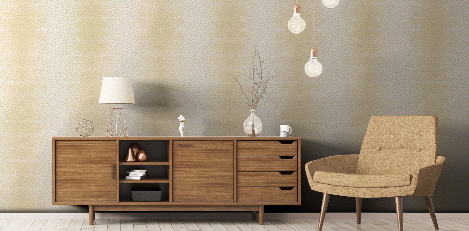 Декоративная штукатурка. Она позволяет скрыть дефекты стен и не утяжеляет пространство. Выигрышно выглядят природные виды на рельефной штукатурке.