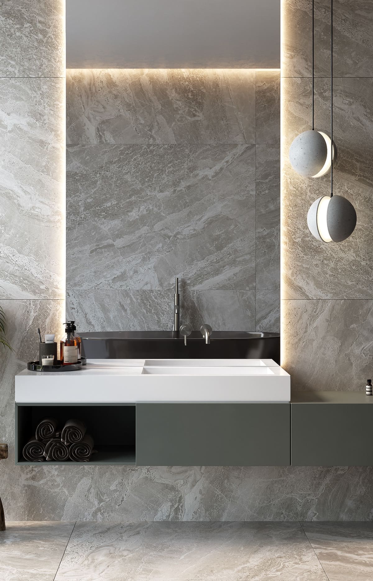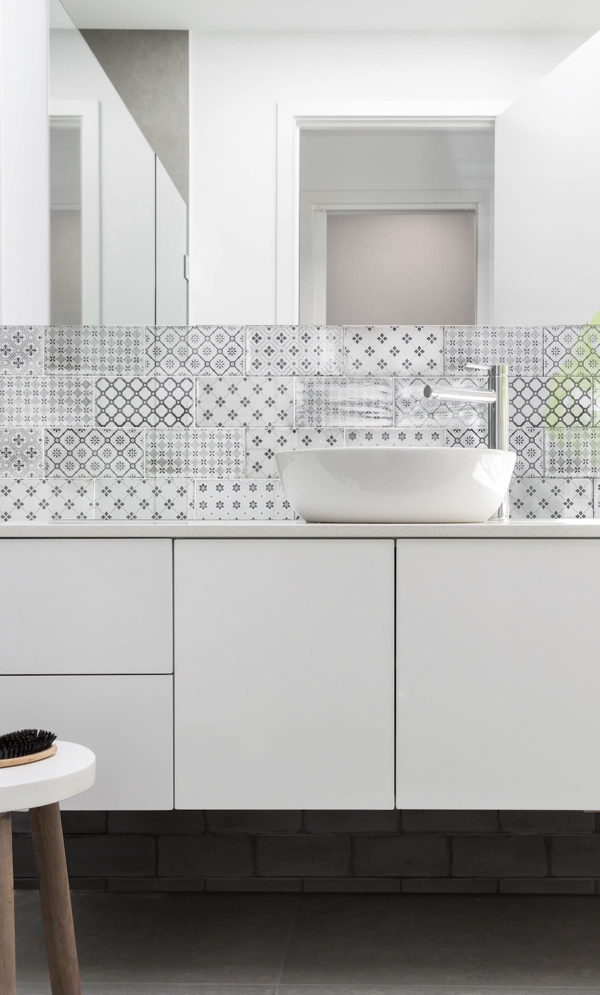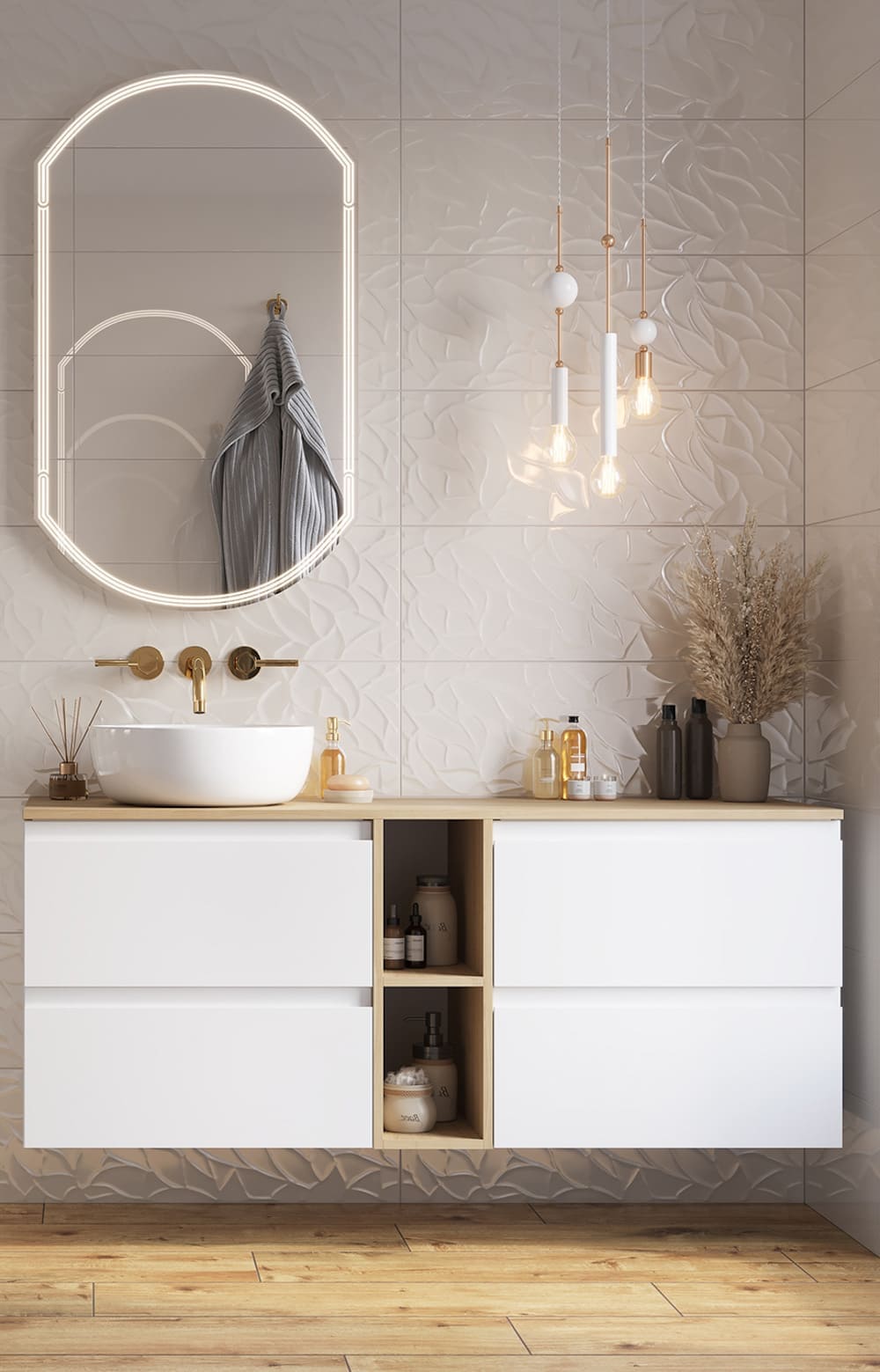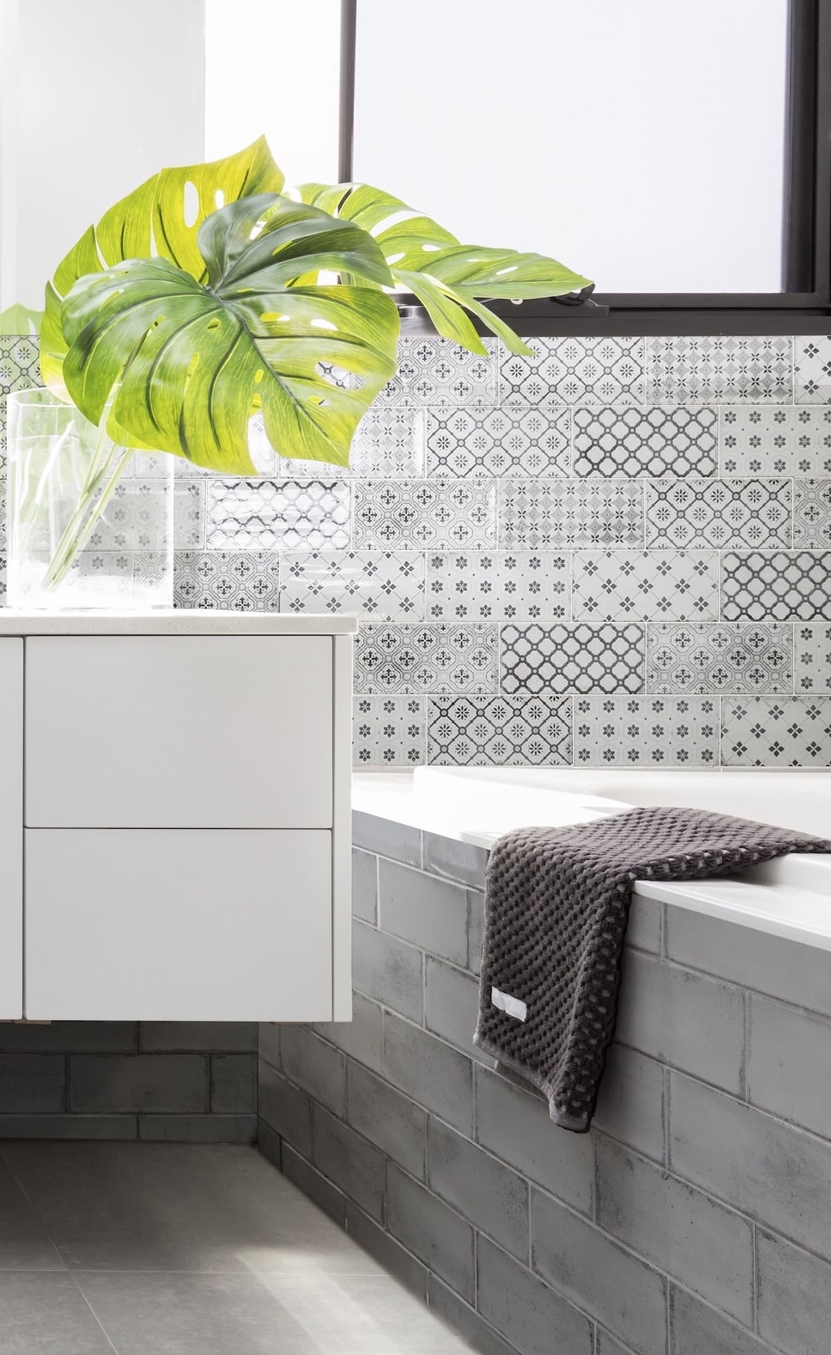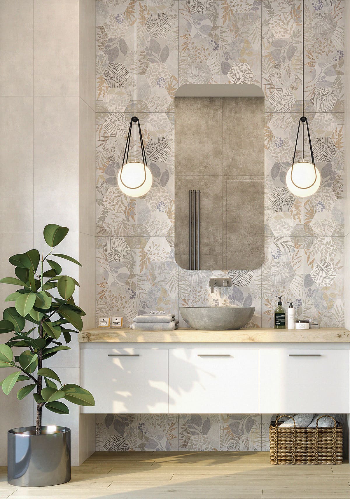 Для создания этого образа используется крупная плитка на полу и стенах или плитка под дерево приглушенных оттенков белого, серого или бежевого. Также популярна бетонная плитка.
