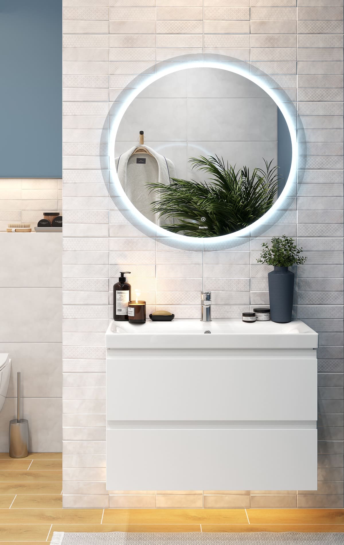 Поясним спорное. Когда впервые слышат об имитации бетона и дерева, обычно представляют себе мрачную брутальную ванную в стиле лофт, не меньше. На самом же деле с помощью такой плитки можно получить очень разный дизайн и сейчас будет идеальный пример.