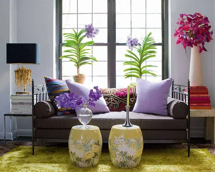 Декор небольшой гостиной фиолетовыми соцветиями орхидейИсточник izby.org