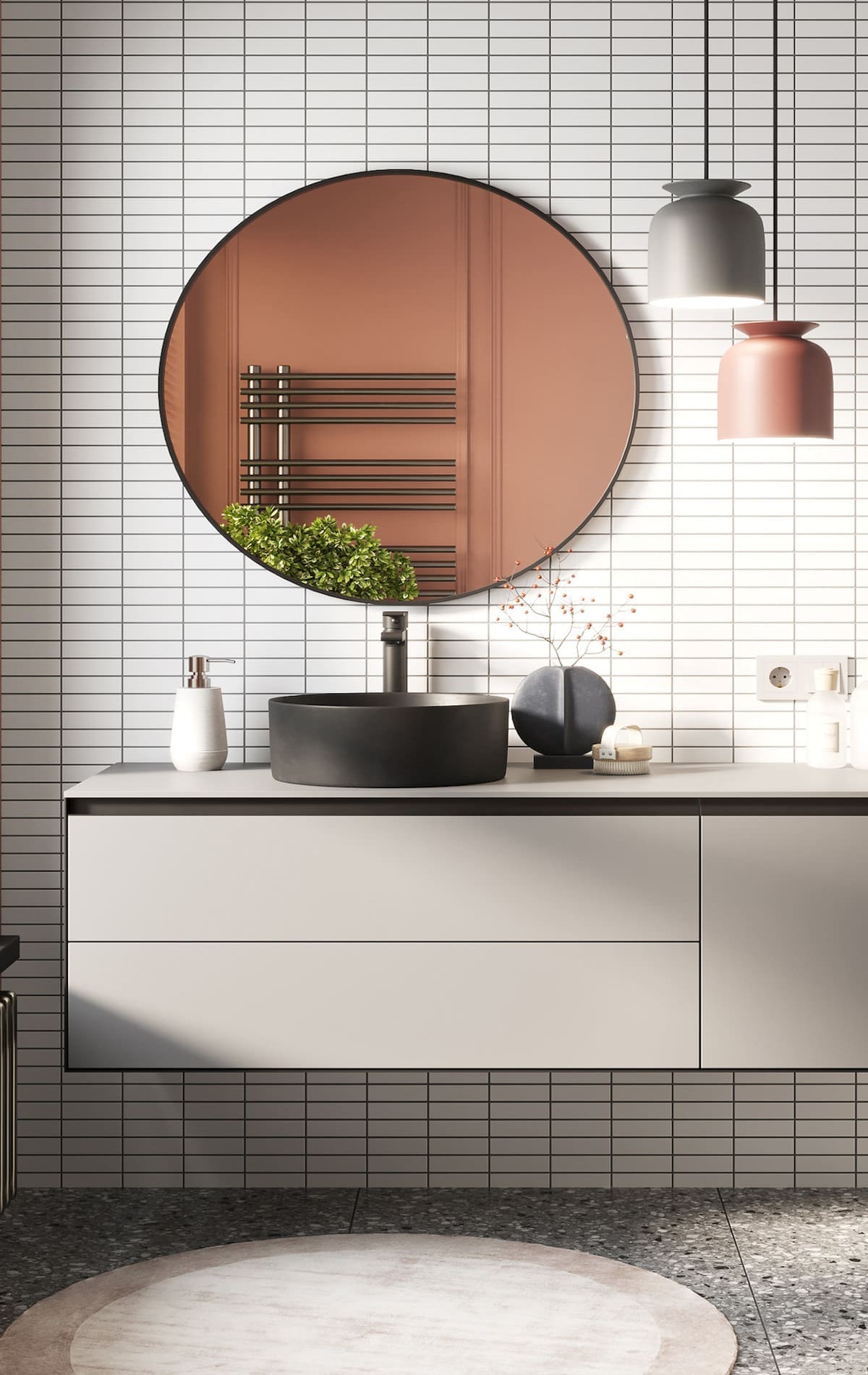 Для интерьера с современным, минималистским характером идеально подходит плитка, имитирующая необработанный бетон. Однако это не исключает художественно включенного декора стен — он не нарушает гармонию, но придает интерьеру уютный характер.