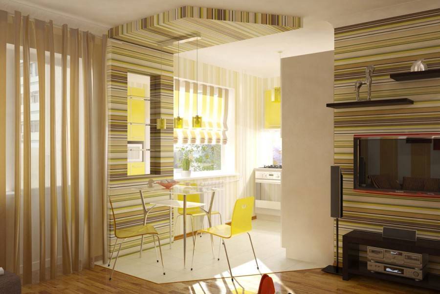 Известно, что тёмные цвета сужают пространство, следовательно, ориентироваться нужно на светлые и яркие оттенки. Для создания эффекта глубины и разграничения зон можно использовать тёмные вставки, состоящие из горизонтальных или вертикальных полос. Это будут своеобразные акценты, которые украсят и оживят помещение.