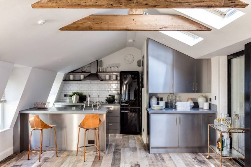 Небольшая аккуратная кухня, обустроенная на чердачном этаже