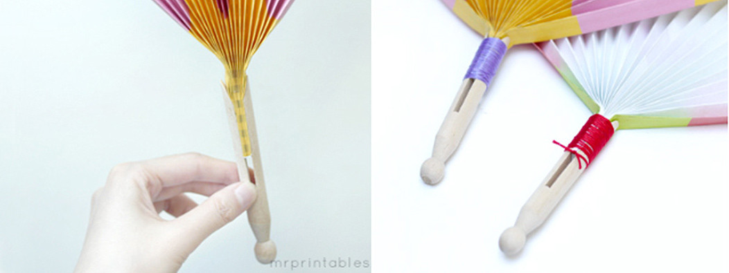 Распечатайте на цветном принтере заготовки из бумаги, сложите их в гармошки, склейте между собой с одной стороны, а нижний край веера зажмите детевянной прищепкой, и зафиксируйте (обмотайте ниткой или скотчем).