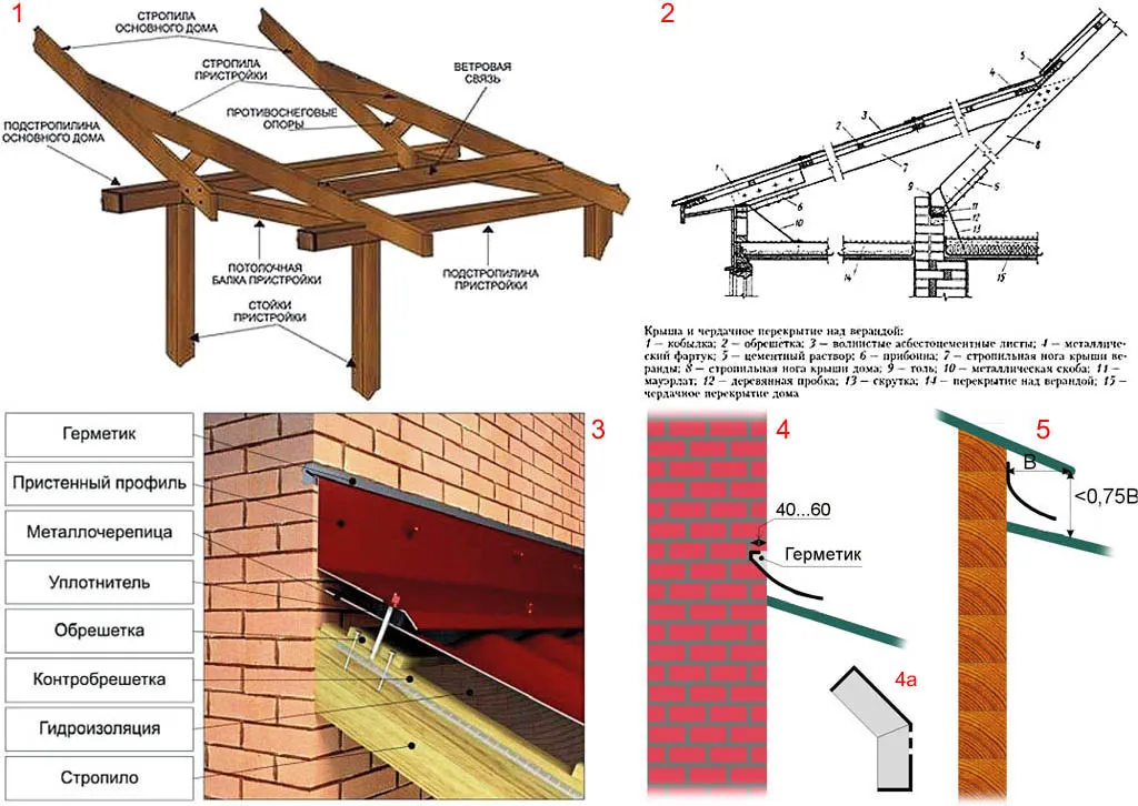 Деревянную стену штробить нельзя, это откроет дорогу грибкам и насекомым при любой пропитке. В таком случае придется ежегодно осматривать герметик и при необходимости заменять. Но если веранда под свесом двускатной или вальмовой крыши, можно просто подвинуть стык крыши веранды со стеной повыше, поз. 5. Если зазор между кровлями не более 3/4 свеса крыши дома, затекание воды по стыку исключено.