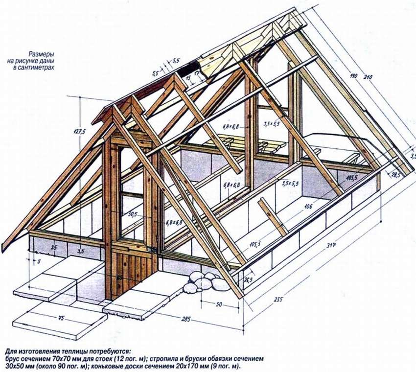 Чертёж зимней теплицы из дерева с размерами в сантиметрах