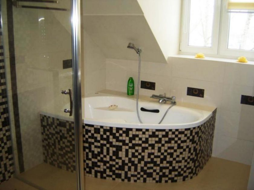 - Во-вторых, вместо того чтобы устраивать прямоугольную купальню вдоль одной стены, можно выбрать угловой аналог или душевую кабину;