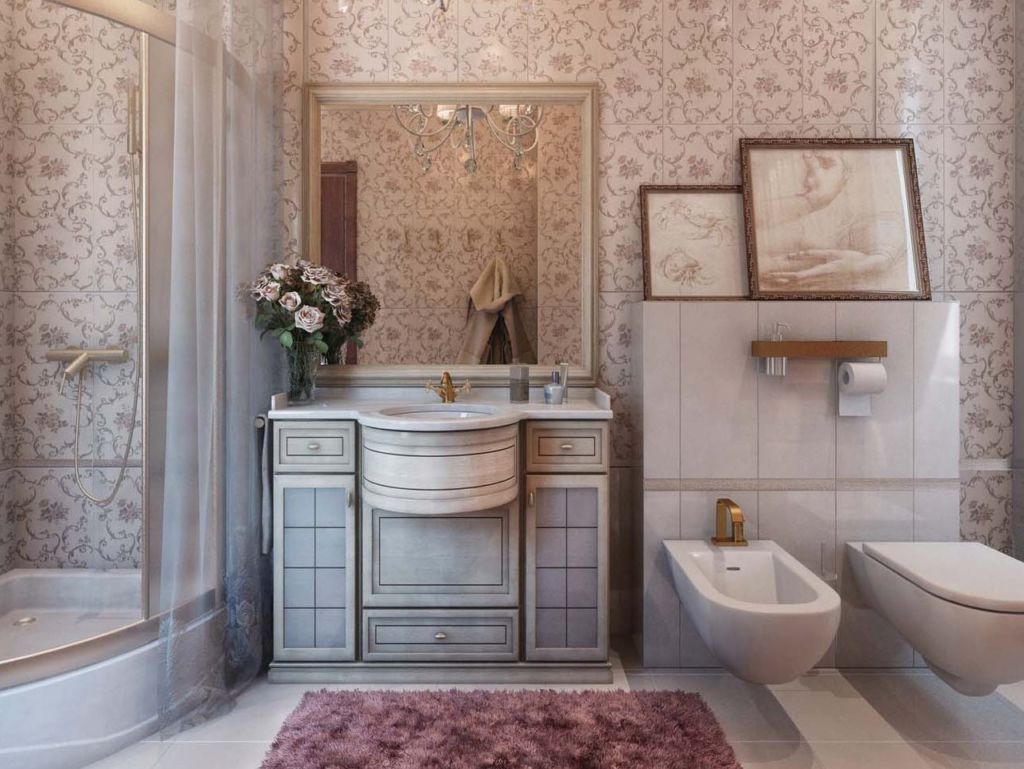 - классика. Ванная в классическом стиле подразумевает использование кафеля одного цвета или сочетание светлого верха с более темным низом, которые могут быть разделены фризом. Возможно совмещение однотонной плитки и орнамента;