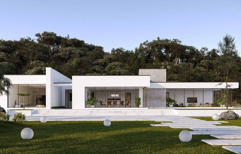 Проекты отличаются простотой линий и привлекают внимание продуманными и изысканными геометрическими формами. Плоская кровля, минимум декоративных элементов, сочетание светлых тонов, а большие окна располагают к общению с природой