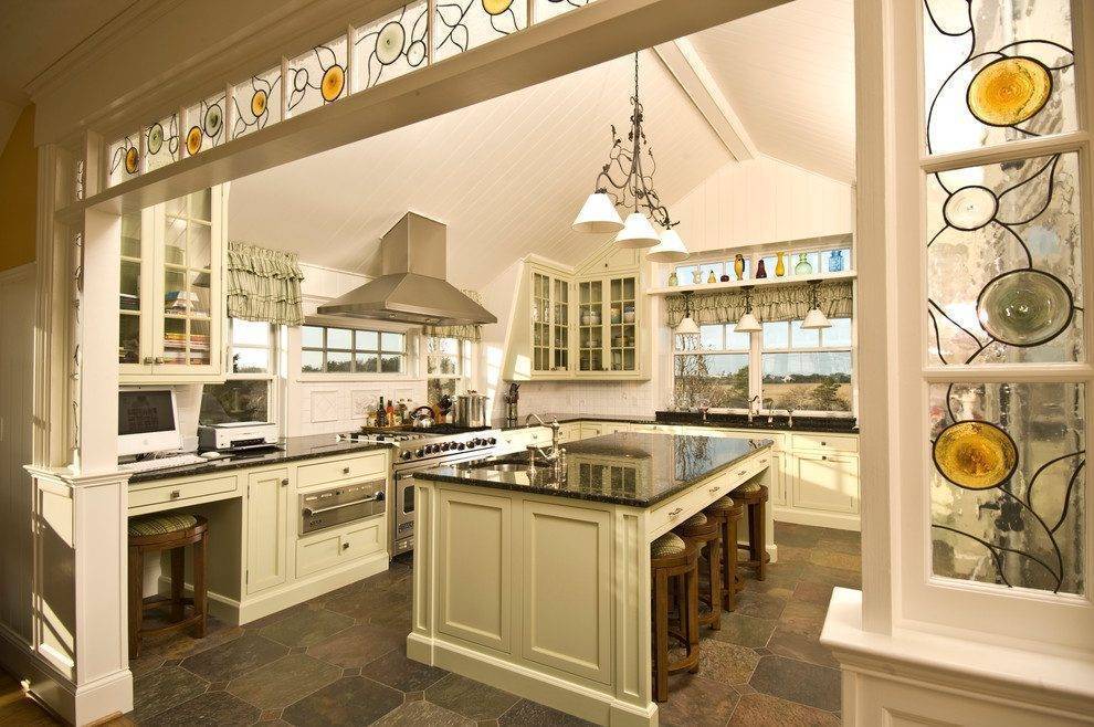 В кухню подбирают тему овощей, фруктов, продуктов. Чтобы добавить комнате света, выбор останавливают на оранжевых, желтых витражах.