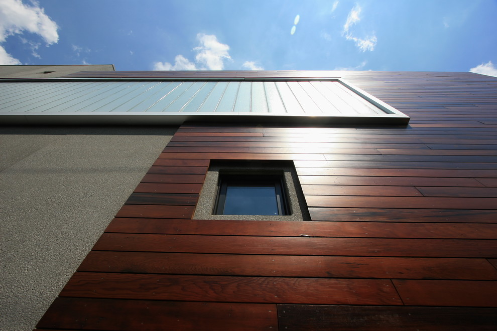 При внешней отделке его края захватываются и присоединяются к постройке алюминиевой или стальной рамкой, что архитекторы обычно называют витриной или занавесом. Здесь также виден подрамник, который охватывает весь периметр кромок, предназначенный для сбора воды и направления её в наружные стенные системы.