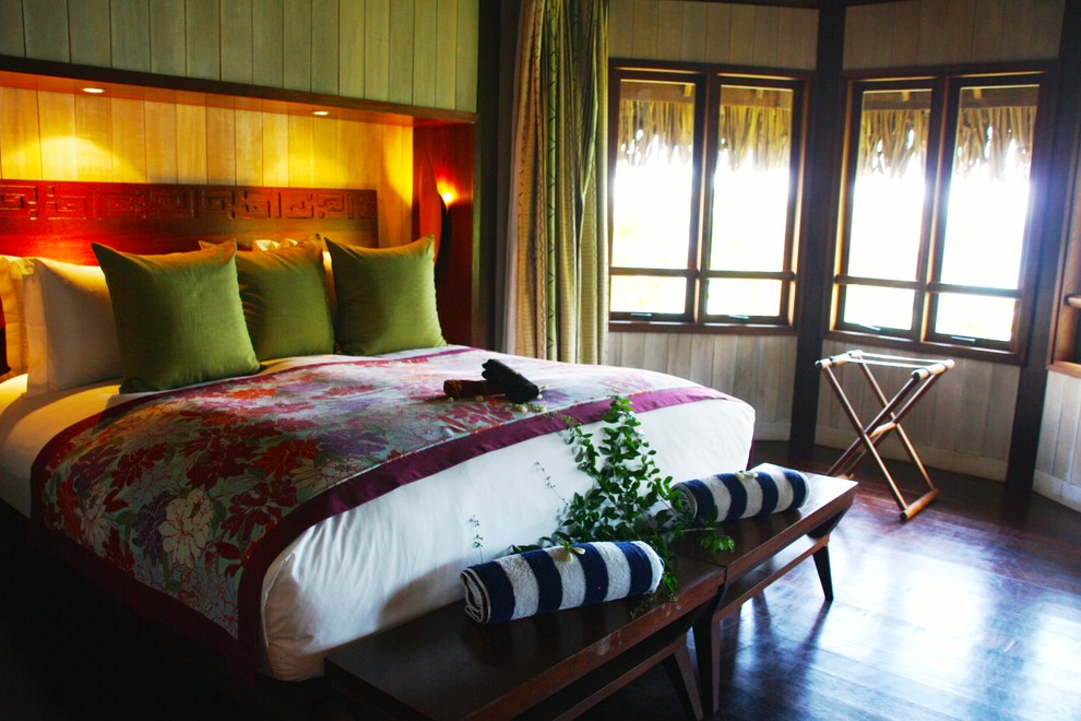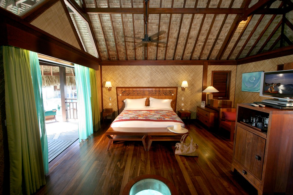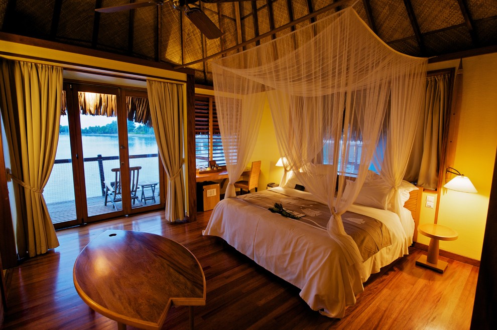 На фото — спальня в бунгало на сваях, входящего в состав Sofitel Bora Bora Private Island.
