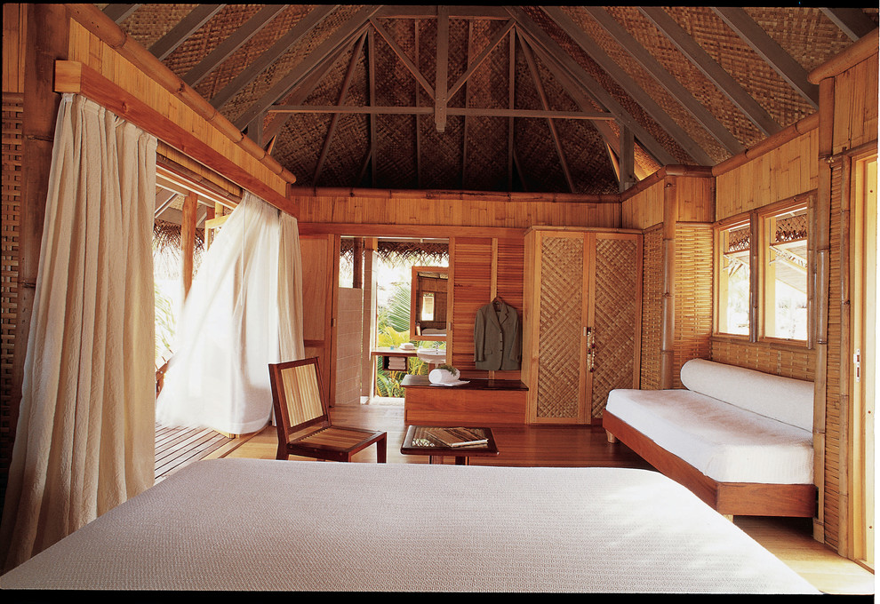 Прежде всего, используйте натуральные материалы. Перед вами номер отеля Le Moana на Бора-Бора. Дух тропиков наполняет тёплое, медового оттенка пространство комнаты, декорированной тканью из кокосовых волокон.