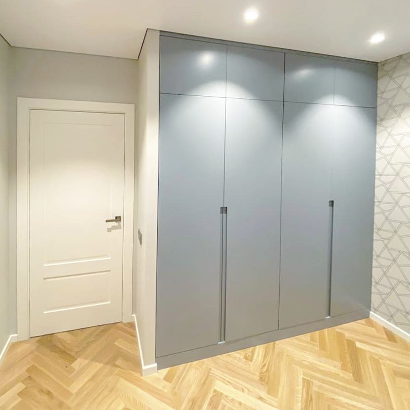 Шкаф с распашными створками можно сделать сплошной стеной и установить механизмы открывания при нажатии на дверку.
