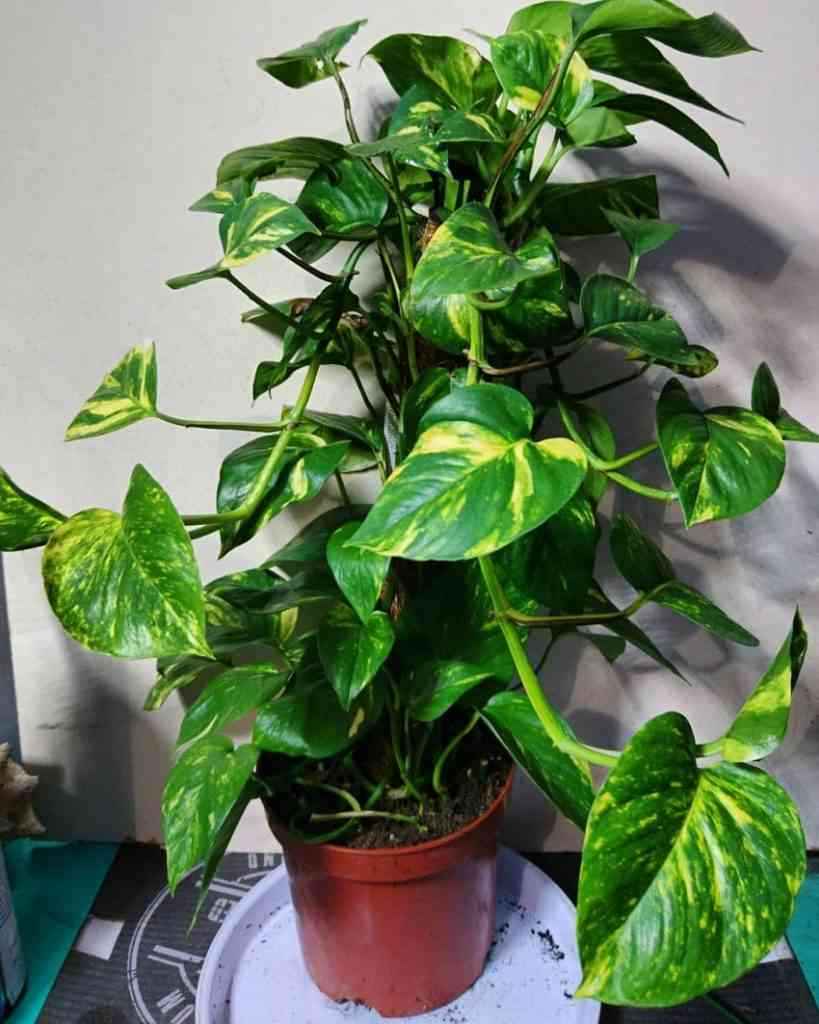 Сциндапсус. Комнатное вьющееся растение, для выращивания которого не потребуется много времени и сил. Расти он может практически в любых условиях. Цветок можно подвесить у окна или расположить в самом дальнем углу комнаты. Его ярко-зеленые листья отличаются светлыми пятнами и формой сердца. Домашняя лиана быстро разрастается, выпуская новые побеги, которые могут просто свисать или опутывать опору. Чтобы получить растение с пышными побегами, его рекомендуется периодически прищипывать.