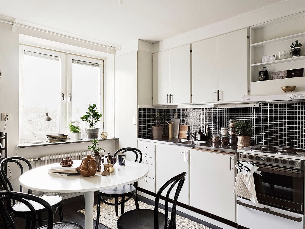 Черно-белое сочетание цветов в оформлении фартука из мозаики