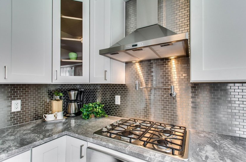 Зеркальная мозаика создает необычную атмосферу на кухне. Благодаря отражению, визуально увеличивает пространство. Для укладки выбирают прозрачную затирку.